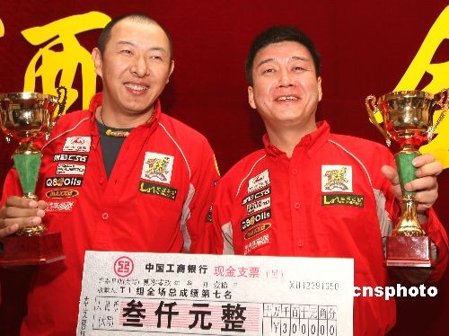 3月10日,經過三天的激烈角逐,“金馬杯”第六屆漠河冰雪汽車越野賽暨全國汽車越野系列賽,在黑龍江省漠河縣境內中俄界江黑龍江攝氏零下20多度的自然冰雪江面上結束,長豐汽車華南虎車隊劉斌(右)在三天的比賽中兩次奪得“飛車王”獎,最終獲得全場“飛車王”獎。中新社發 趙振清 攝