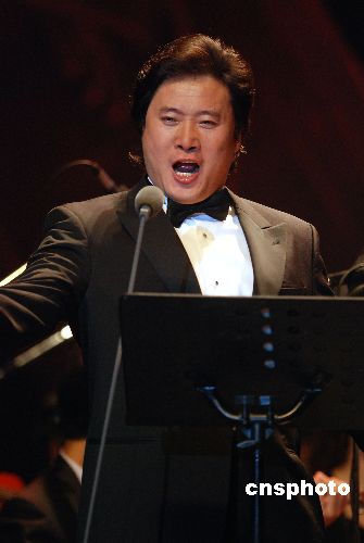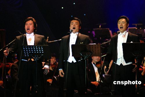 10月24日晚,華人三大男高音丁毅、范競馬、戴玉強在北京傾情高歌,由此,《我們的奧運》之“全球華人三大男高音”世界巡演音樂會正式啟動。當晚,三人除了演唱西洋經(jīng)典歌劇選段《今夜無人入睡》、《重歸蘇蓮?fù)小返韧猓演唱了多首中國民歌和祝福奧運的《北京頌歌》。承辦方華視嘉禾介紹說,“三高”此次巡演是代表全球華人藝術(shù)家向北京2008年奧運會獻上的一份祝福,也是表達對不久前去世的世界著名男高音歌唱家帕瓦羅蒂的緬懷。不久前,丁毅、范競馬、戴玉強已通過工商局注冊為“華人·三高”的品牌。至此,中國聲樂界也有了“三高”。他們表示,“三高”的提法并非指“中國最頂尖的三大男高音”,而只是眾多優(yōu)秀男高音之中具有代表性的三位。中新社發(fā) 李學(xué)仕 攝