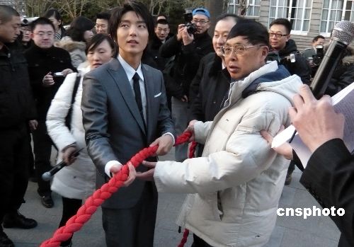 1月13日,愛浪(國際)文化產業集團與韓國COMA公司在北京中國人民對外友好協會舉行締結聯盟簽約儀式,雙方將在多個文化項目上進行合作,圖為在簽約儀式前中國人民對外友好協會會長陳昊蘇與“中韓文化交流大使”韓國人氣偶像李俊基等一起敲響“和平友誼鐘”。中新社發 錢興強 攝