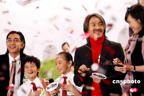 一月十四日,香港著名影星周星馳攜一眾演員出席記者會,為其導演的電影《長江7號》宣傳。蟄伏三年的喜劇巨星周星馳,執導具有特別效果的電影《長江7號》,將在本月三十一日上演。中新社發 洪少葵 攝