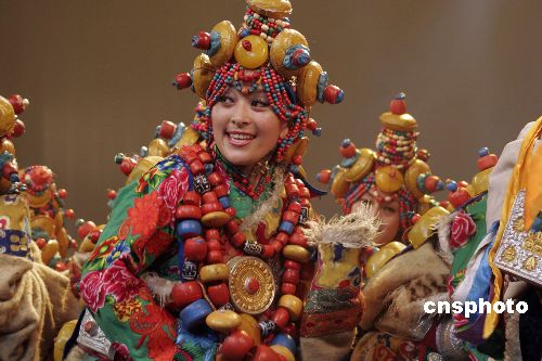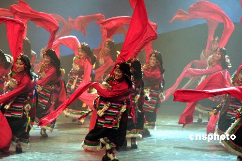 2008年1月21日,著名舞蹈家楊麗萍攜《藏謎》在海口人民大會堂上演。《藏謎》以藏族老阿媽虔誠的朝拜路途中所見為主線,表現(xiàn)了藏區(qū)牧民生活、民間習俗、宗教儀式場景。主創(chuàng)人員用了1年多的時間,行走在藏、青、川、云等各省區(qū)的20多個藏區(qū),大量收集了音樂、舞蹈、器樂、服裝等作為原始創(chuàng)作素材。劇中8成以上的演員都是藏區(qū)的牧民,完全是原生態(tài)的演出。中新社發(fā) 尹恩彪 攝