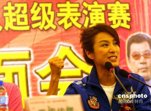 7月5日,香港明星足球隊代表米雪、成奎安、羅家英和泰迪羅賓在重慶參加“2008中國·重慶香港明星足球隊超級表演賽新聞媒體見面會”,為表演賽宣傳造勢。圖為香港明星足球隊啦啦隊隊長米雪回答記者提問。中新社發 郭晉嘉 攝