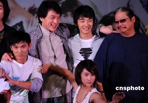 十月十八日,香港影星成龍、洪金寶在北京向人們力薦主演電影《武術之少年行》的三位武術新銳。洪金寶擔綱主演該片,成龍出任該片監制。而該片主演劉峰超(前排右一)是全國劍術冠軍,王文杰(前排左一)也是一名新銳武打演員。該片影片將于十月二十四日在全國上映。中新社發 廖攀 攝