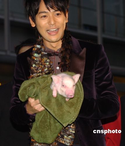 10月18日傍晚,第21屆東京國(guó)際電影節(jié)開(kāi)幕。以“環(huán)保”為主題的本屆電影節(jié)別出心裁地將星光大道的地毯由紅色改為綠色。上個(gè)月剛剛當(dāng)選日本首相的麻生太郎與開(kāi)幕影片《赤壁》劇組成員同走綠地毯,成為第一個(gè)光臨東京國(guó)際電影節(jié)現(xiàn)場(chǎng)的日本總理大臣。圖為日本參賽影片《有豬寶寶的教室》的男主角、著名偶像明星妻夫木聰帶著豬“寶寶”亮相綠地毯。中新社發(fā) 朱沿華 攝