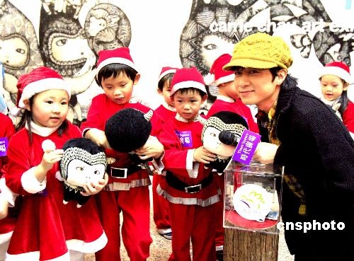 十二月一日,香港藝人古巨基與十位天真可愛的小小圣誕老人在時代廣場一起為護苗基金籌款。中新社發 張勤 攝