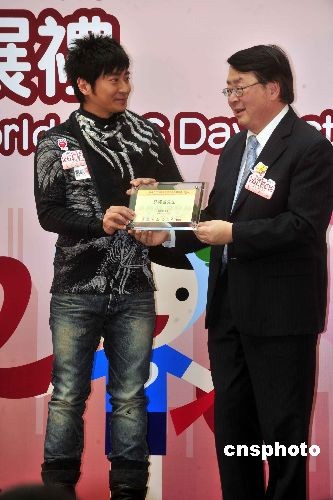 十二月一日是世界艾滋病日,著名歌星孫耀威(左)在香港“2008年世界艾滋病日”活動開展禮上,受到衛生署署長林秉恩的致謝。中新社發 譚達明 攝