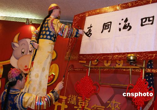 四川大木偶劇團表演了木偶書藝,木偶用毛筆寫下“四海同春”四個大字,贏得滿堂彩。