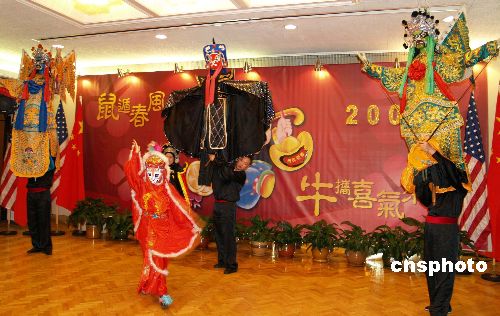 1月16日,中國駐洛杉磯總領館舉行“2009華僑華人新春招待會”,中領館多功能大廳大紅燈籠高高掛,充滿濃濃的過年味。總領事張云率全體領事與600多位華人華僑代表歡聚一堂,共慶牛年的到來。中新社發 盧威 攝