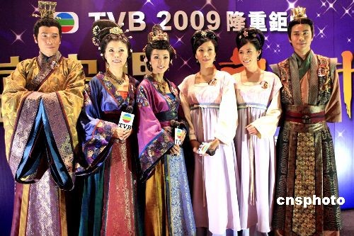 三月二十三日,《宮心計》在香港會展中心舉行開幕儀式。圖為演員佘詩曼、米雪、關菊英等在儀式上合影。中新社發 張勤 攝