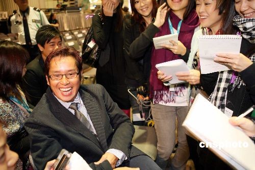 三月二十六日,著名藝人譚詠麟在會展中心出席“第四屆香港音樂匯展”開幕活動時,繼續被大批傳媒追訪 “義子”關楚耀在日本涉嫌藏毒被扣押的后續事情。中新社發 洪少葵 攝