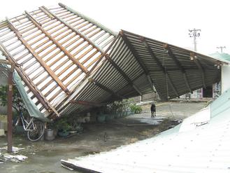 南和村民賴義浩前晚在祖厝睡覺,突然聽到轟然巨響,嚇得跑出屋外,看到整片木造鐵皮屋頂掀開,翻落到數米外,嚇得說不出話。