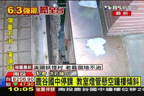 中新網(wǎng)6月3日電 據(jù)臺(tái)灣TVBS網(wǎng)站報(bào)道,6月2日13時(shí)43分,臺(tái)灣南投縣(北緯23.9度,東經(jīng)120.9度)發(fā)生6.7級(jí)地震(臺(tái)灣島內(nèi)氣象部門測(cè)定為6.3級(jí)),震源深度9.0公里。南投鹿谷中學(xué)也受到地震影響,校園內(nèi)多處毀損,3日停課一天。