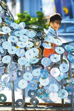 中新網11月8日電 據臺灣《聯合報》報道,午后陽光泄照下,臺中市綠園道上,由廢光盤片所組合的裝置藝術,吸引了路人的注目,也讓人感受到廢物利用的美意。