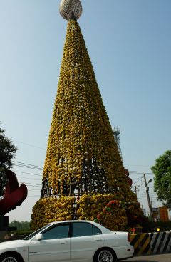 據臺灣“中廣新聞網”報道,數量龐大的橙子果海,堆聚在云林古坑知名的綠色隧道景點周邊,映照一片金黃意象,極為壯觀。一株高達五層樓、號稱全世界最大的橙子圣誕樹,就矗立于綠色隧道入口處熱情迎賓,吸引民眾爭相拍照留念。