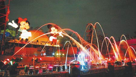 一等主舞臺(tái)背景音樂響起,軌道兩側(cè)的米老鼠主燈,緩緩向舞臺(tái)中央靠攏,水舞與燈光迸射而出,在漆黑的夜空中令人驚艷,不少民眾為此歡呼連連,測試時(shí)間約十五分鐘。