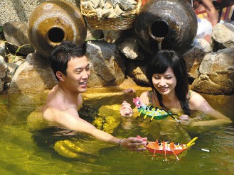 昨天推出的“雄黃酒湯”,在溫泉里加入適量的雄黃酒。據(jù)介紹,雄黃酒含有三硫化砷,不可多喝,但用來泡澡凈身,可以消除疫病,溫泉池畔放了一壺雄黃酒,游客還可以沿襲傳統(tǒng),用手指或毛筆沾酒,在額頭寫一個“王”字,體驗古代人驅(qū)邪的儀式。