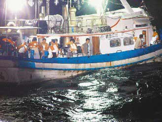臺灣漁船被日本巡邏艦撞沉,船員在沉沒前準備逃生。