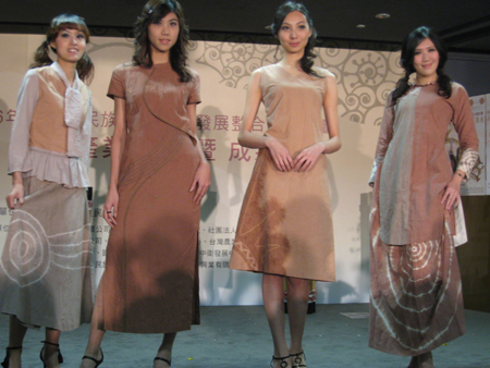 中新網1月18日電 據“中央社”報道,臺灣原住民部落產業發展營銷成果展十七日在南港開幕。排灣人設計師以檳榔子染布結合排灣人傳統圖騰的百步蛇蛇紋組合設計的創意植物染服飾,環保且健康。結合白色代表純潔、紅色代表血液、菱形圖案代表祖靈的眼睛,所設計的旗袍也在2007全球城市小姐選拔賽大受贊許。(翁翠萍)