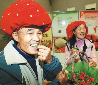 中新網(wǎng)11月30日電 臺灣農(nóng)業(yè)部門舉辦的“二00七十大經(jīng)典水果“票選活動,原本一路領(lǐng)先的臺南芒果大意失荊州,被苗栗草莓突襲,在投票截止前三小時翻盤,登上票選王座。苗栗縣長劉政鴻昨天興奮地戴上“草莓帽”領(lǐng)獎。