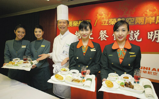 兩岸周末包機公司不只搶頭班機、比載客率,在餐點上也相互較勁。華航昨(1)日宣布商務(wù)艙將推出臺北故宮“晶華國寶宴”,圖中長榮、立榮則推出涵蓋兩岸各地的風(fēng)味菜色。(臺灣《聯(lián)合報圖》)