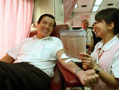 報道說,經常捐血的馬英九今天捐出兩袋血,共五百c.c.,捐完血并愉快地向記者說捐血很快樂,并和捐血車工作人員合影留念。馬英九累積已捐出一百七十八袋血。