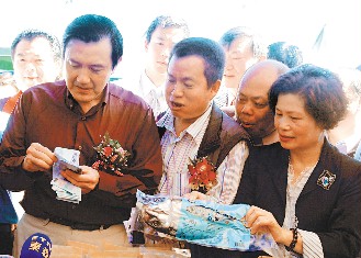 馬英九23日到宜蘭縣參加鯖魚節活動,當場掏出一迭鈔票,數了兩萬元買魚松、鹽漬鯖魚等產品,希望民眾也多消費。圖片來源:臺灣《聯合報》