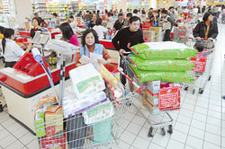 臺北盧小姐在凌晨3時前往大潤發購物,她說,使用3600元消費券購買年菜可獲300元滿額折價券,夜間購物還可現抵200元,等于現賺500元。大潤發公關何默真表示,消費券約占業績三成多,刷卡付款比例大幅降低,也讓賣場省去上百萬元手續費。