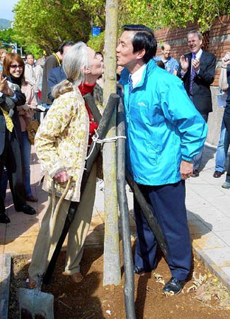 馬英九與支持者隔著小樹“接吻”,逗樂圍觀人群。