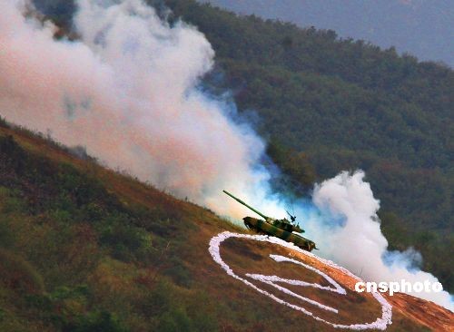 代號為“前鋒--2008”的為中國人民解放軍濟南軍區某裝甲旅進攻戰斗檢驗性實兵實彈演習,10月28日11時在確山合同戰術訓練基地進入機動化、立體化、諸兵種協同、山地進攻戰斗階段。戰斗在復雜信息化火力戰、諸兵種聯合作戰條件下,突出現代戰爭適應、聯合作戰協同、部隊作戰能力體現等特點,按照信息火力打擊(火力突擊、電磁攻擊、綜合破障)、綜合攻擊(多路強攻、超越攻擊、縱深遮斷)、奪點控域(立體攻占、聚殲控域、鞏固陣地)等內容實施。演習中在北京國防大學、南京陸軍指揮學院學習的60余國170余名留學生全程觀摩演習,并參觀武器裝備,部隊日常生活秩序、營區建設等內容,這是中國人民解放軍演習首次大規模對外國留學生開放。中新社發 宋吉河 攝