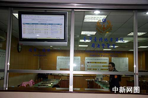 12月29日下午2時,臺北地方法院召開前臺灣地區(qū)領導人陳水扁羈押庭,經過長達12多小時的庭訊、評議后,合議庭審判長蔡守訓30日2時25分裁定將陳水扁羈押,但不禁見。陳水扁被收押的公告就是在這里發(fā)布。 (中新社記者 陳立宇/攝)
