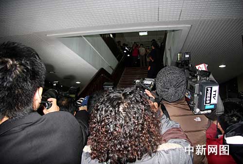12月29日下午2時,臺北地方法院召開前臺灣地區領導人陳水扁羈押庭,經過長達12多小時的庭訊、評議后,合議庭審判長蔡守訓30日2時25分裁定將陳水扁羈押,但不禁見。圖為消息傳出后,臺北地方法院樓上樓下一陣騷動。 (中新社記者 陳立宇/攝)