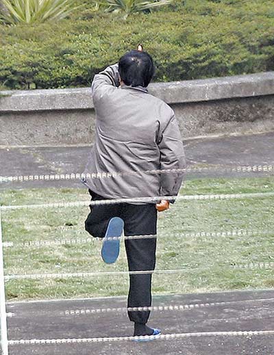 電視畫面顯示,陳水扁在放風(fēng)中,沿著看守所內(nèi)的小操場(chǎng),進(jìn)行慢跑,大約持續(xù)了20多分鐘左右;放風(fēng)時(shí),也由幾名員警戒護(hù),隨時(shí)注意周邊狀況,警察也手持望遠(yuǎn)鏡,注意四周制高點(diǎn)的狀況。