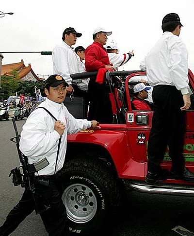 在聞訊陳水扁及呂秀蓮遭槍擊后,在國民黨中央黨部前也準(zhǔn)備出發(fā)掃街的連宋陣營聞訊,立即緊急成立一級戒備,特勤人員荷槍實(shí)彈,如臨大敵。