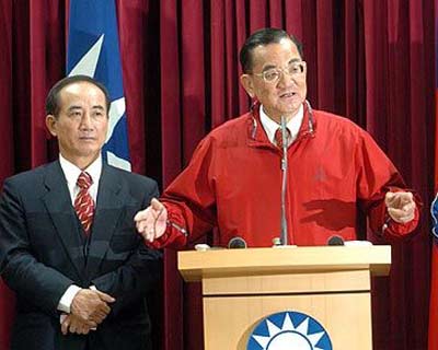 候選人連戰(zhàn)(中)傍晚召開記者會宣布所有競選造勢活動暫停,并促當(dāng)局盡速公布陳水扁遭槍擊的細(xì)節(jié)。
