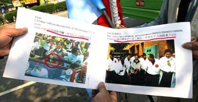 國親聯(lián)盟臺中一位支持者在CNN及蕃薯網(wǎng)站上,下載圖片比對阿扁遭槍擊始末圖片,提出阿扁中槍時夾克有血跡,但進(jìn)入醫(yī)院前卻沒有,質(zhì)疑槍擊作假。