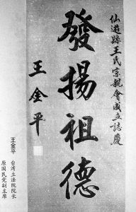 在日前舉行的仙游縣王氏文化研究會成立大會期間,仙游的王氏宗親們收到了來自臺灣王氏宗親王金平為王氏宗親會成立發(fā)來的賀呈。王金平的題詞是:發(fā)揚祖德。(如圖)