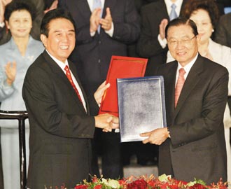 中新網11月5日電 臺灣《聯合報》今天頭條報道,兩岸海協海基兩會臺北會談4日順利舉行,海基會董事長江丙坤和海協會長陳云林共同簽署海運、空運、郵政及食品安全四項協議。陳云林并且邀請江丙坤,明年上半年前往大陸,進行第三次“江陳會”。