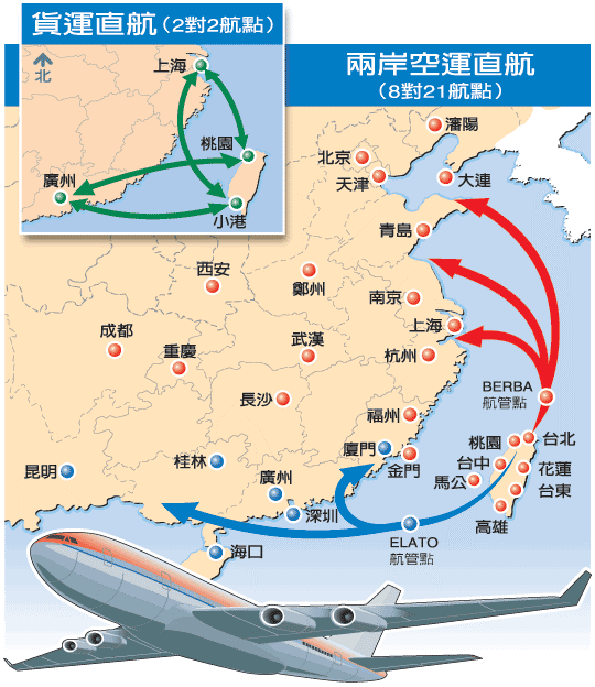 根據(jù)協(xié)議,兩岸直航將不必再繞經(jīng)香港飛航情報區(qū),以臺北飛上海為例,截彎取直后的飛行時間將由原先的2個半小時縮短為只需82分鐘,比從臺北搭高鐵到高雄還要快很多。