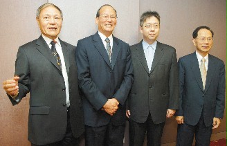 臺灣海運四大巨頭正利董事長周家獻(左)、陽明海運董事長盧峰海(左二)、萬海董事長陳柏廷(右二)、臺航董事長張義源(右)28日齊聚一堂,談兩岸海運直航對產業發展的重要性。(圖片來源:臺灣《聯合晚報》)
