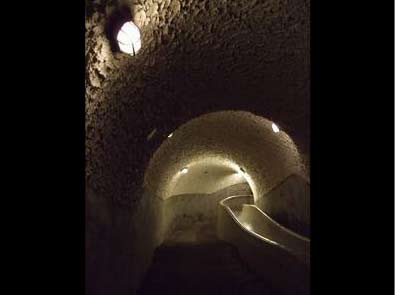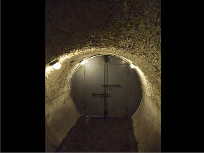 記者當日潛入探險的即為西密道。這條看似簡單的密道長180米,高210公分、寬223公分,有86臺階、45個防爆燈,滑梯90米長,還設有獨立電源、空調、排水、緊急廣播。建材則是防爆白洋灰、鋼筋水泥。密道坡度很陡,一路走下,就彷佛進入了時光隧道,四周昏暗慘白的氛圍,嘿,還真感覺到一些風聲鶴唳的緊張氣氛。雖說從建好到現在,密道完全沒有使用過,詭異的是,光滑的溜滑梯上卻留有許多黑色長條刮痕,難道是人沒使用過,卻曾運輸過槍械軍火?