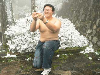 據(jù)臺(tái)灣《聯(lián)合報(bào)》報(bào)道,周漢勛是成大四年級(jí)學(xué)生,和朋友從合歡山一路玩到太平山,看到情侶們雙雙對(duì)對(duì)在雪中散步,十分羨慕;當(dāng)場(chǎng)脫光上衣,跪在雪地上,手拿一把“雪花”,請(qǐng)記者為他傳情,向暗戀已久的學(xué)姐告白,“我喜歡你很久了,只想告訴妳,我喜歡你,我們?cè)谝黄鸢桑 ?/p>