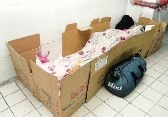 中新網2月15日電 寒流連日來襲,臺北市一度掉到攝氏六七度,使得大批游民涌入臺北火車站避寒。原本約僅數十名游民“駐地”的臺北火車站,這幾天一下子爆增到兩百多人。不少游民用厚紙板搭成簡陋帳篷御寒,雜物散置一地,使得臺北火車站一些角落仿佛“難民營”。