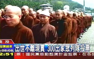 據(jù)臺(tái)灣媒體報(bào)道,10多輛大型游覽車,載著中臺(tái)禪寺的300多名和尚、尼姑,一同抵達(dá)投票所。300多人列隊(duì)整齊排在投票所外等候。
