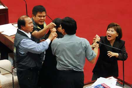 中新網4月9日電 據“中央社”報道,臺北市“議會”8日發生“議員”口角,市“議員”楊實秋(中背對鏡頭)認為鄰座的莊瑞雄(左二)干擾他發言,雙方爆發口角,眾“議員”紛紛趕來勸架,在“議長”宣布休息后才結束紛爭。