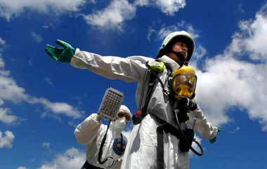 演習中舉行輻射彈爆炸處置,身著防護衣的臺軍部隊進行輻射偵測