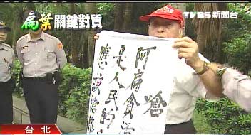 據臺灣TVBS報道,顧不得被大批警力包圍,有話要說的老伯伯努力甩開束縛,掙扎中,趁機秀出抗議陳水扁的海報。抗議老伯伯:“你看看應該判死刑!對不對!”