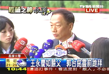 據臺灣TVBS報道,郭臺銘說:“他是除我父親以外第一個跪拜的人,因為我覺得他的精神,他對我的照顧,他給我的啟發,他不但是臺灣工業之父,在我心目中,就像一個嚴父、慈父一樣,所以我覺得我不能表達什么,但是我一點點小小的心意,能夠讓我對他有所的追思,有所的惋惜。”