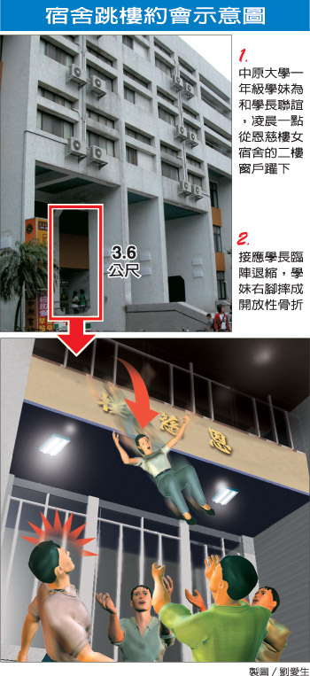 該女生跑到恩慈樓宿舍二樓窗戶,果然看到幾個男生等在一樓,她毫不猶豫,爬上窗往下跳。