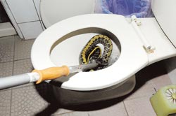 中新網5月11日電 一朝被蛇咬,十年怕馬桶?據臺灣《中國時報》報道,住南投埔里鎮山區的林姓男子,日前坐馬桶小解時,突感下體一陣劇痛,回頭赫見一條巨蛇躲在馬桶里昂首吐舌信,咬破他的陰囊鮮血直流,趕緊負傷求助鄰人送醫;醫生說所幸黑眉錦蛇無毒,否則連小命也不保。
