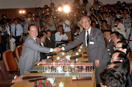 1993年4月27日,首次“汪辜會談”在新加坡舉行。這是1949年以來海峽兩岸授權民間機構領導人的第一次晤談。圖為會談前汪道涵(左)與辜振甫握手。本報資料圖
